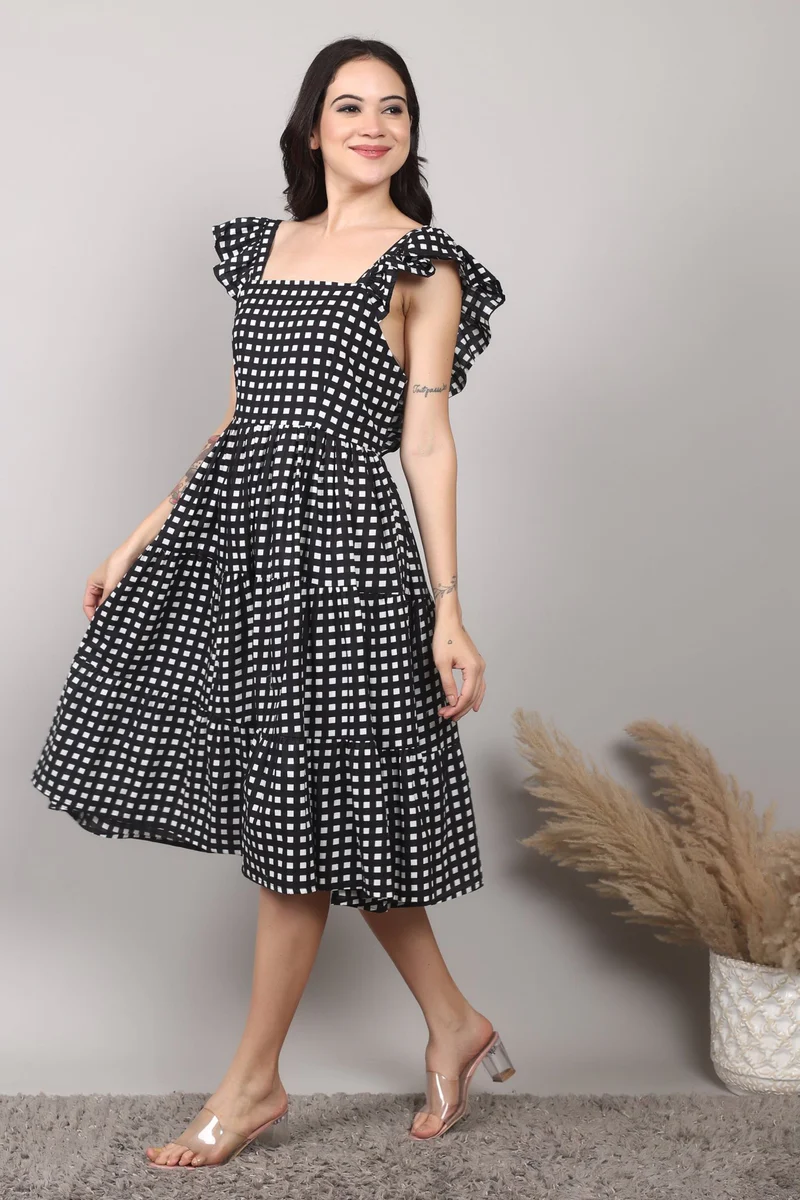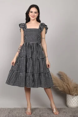 Effortlessly elegant and full of charm 🌸 This black printed midi dress is designed to make you feel beautiful without any effort. With soft ruffled sleeves, a flattering square neckline and a curved tiered skirt, it has a flatteriBest Quality heavy Cotton Dresses.Full Finishing Dress.